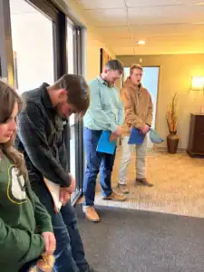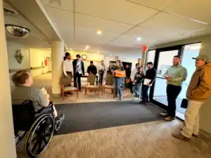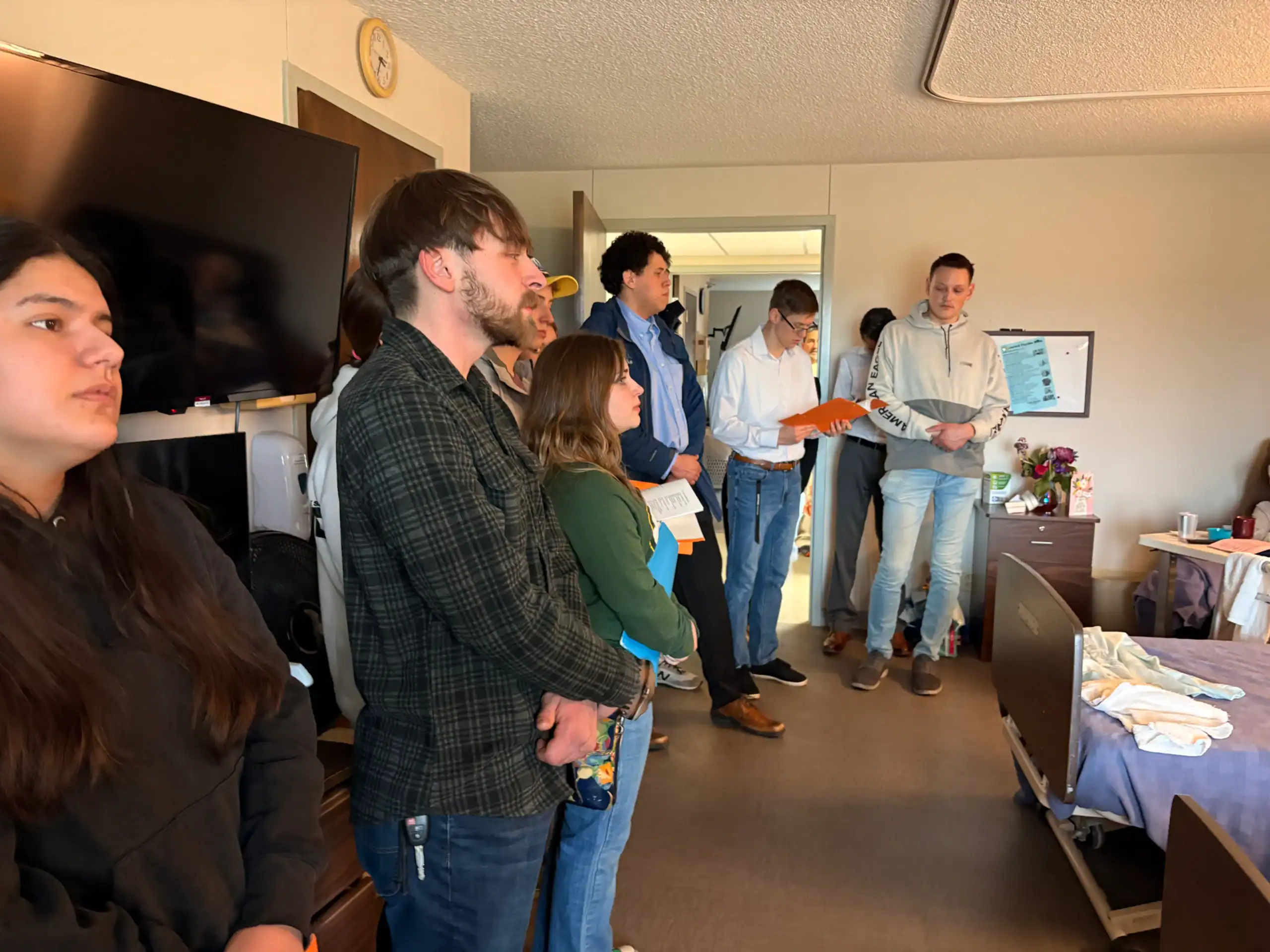 At 2:15, Hannah Bergeon led the young adults beyond the church walls, visiting Hillview Health Care Center. Divided into two groups, they went room to room, singing hymns, delivering handmade Easter cards, and praying with each resident and staff member. Before beginning, the group paused to pray together, inviting the Holy Spirit to guide their interactions.