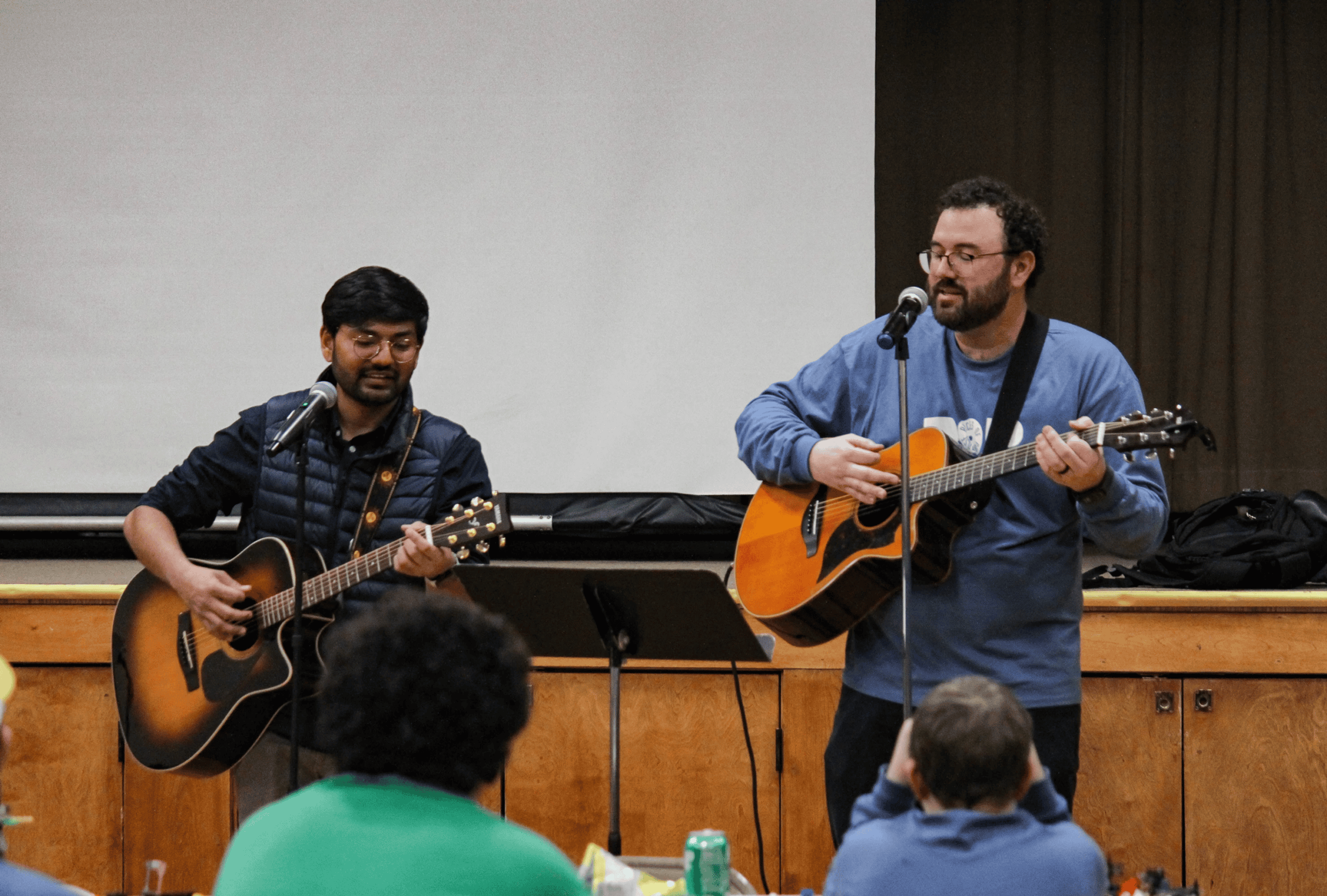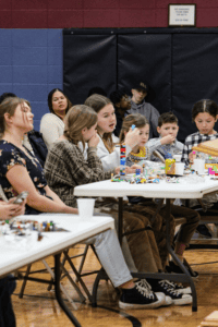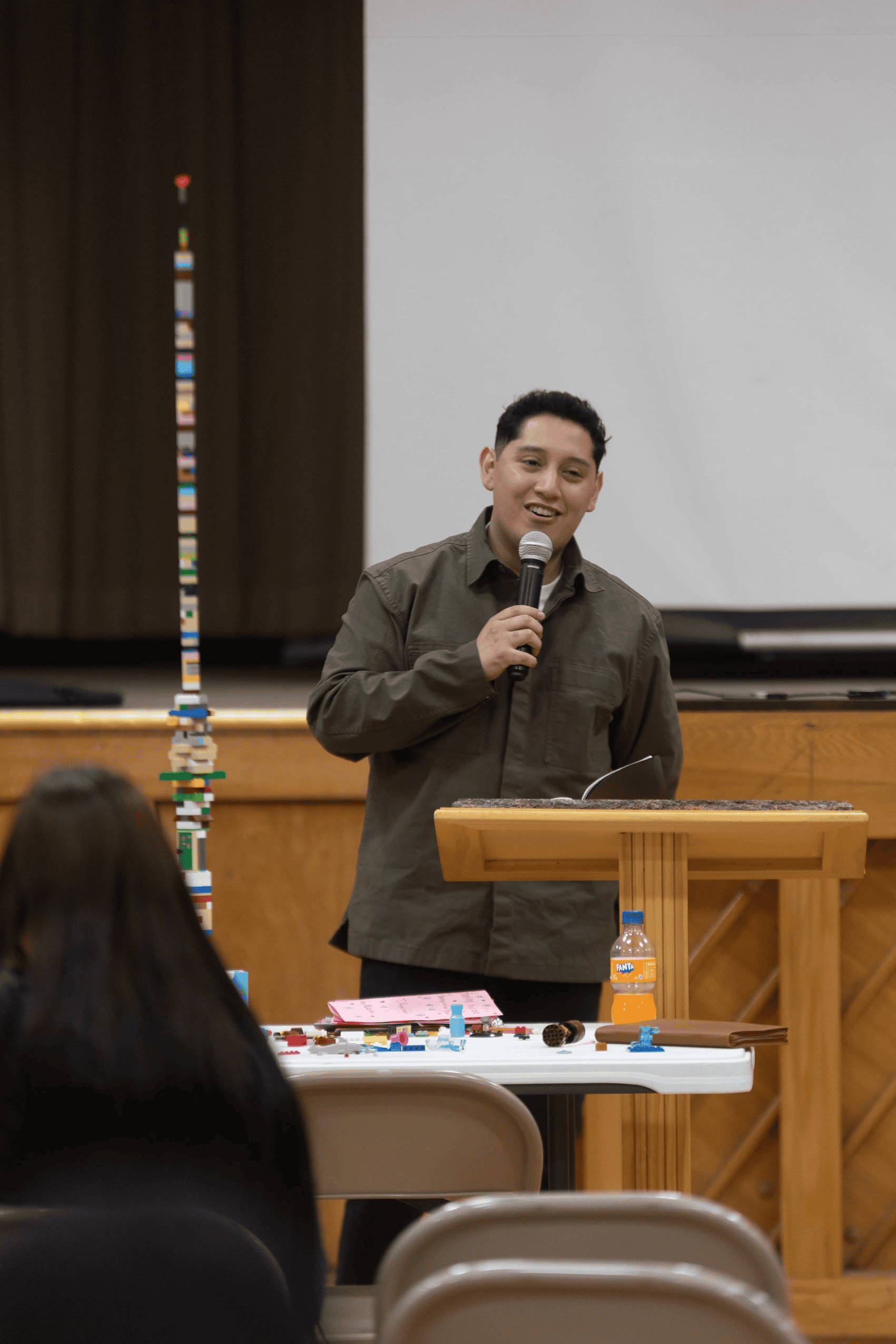 First of all, the event aims to provide a kinetic experience with various fidget options and snacks to help tide young people over if the program goes long (the event starts later than normal church and lunch happens a little later). Especially for those who sit in the front rows, where various tables are situated, there are Legos and puzzles (both have pieces involved). Soda pop, popcorn, pop chips, and lollipops are all snack options. Scattered around the room were also small containers and wands for blowing bubbles (which go “pop“). All of these subtle activities help to reinforce the theme, which is that we are all pieces in the larger picture of God’s purpose. The hands-on elements also offer the chance to do something with one’s hands, while listening to the message.